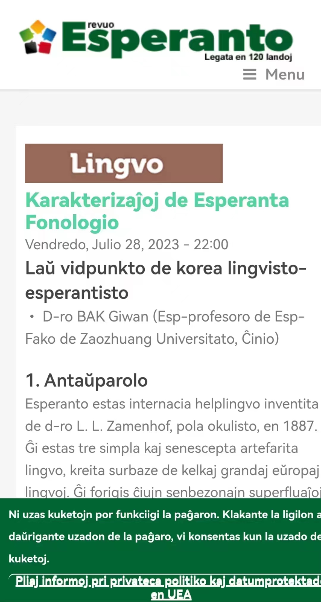 近日,我校外籍教师朴基完博士的论文"Karakterizaĵoj de Esperanta Fonologio"(世界语音韵学特征)在国际世界语协会机关刊物《世界语》(Esperanto)2023年第7-8期上发表。论文从音韵学角度分析了世界语的发音、拼读特点,是一篇世界语音韵学高质量论文,引起了国际语言学和世界语学界的关注。