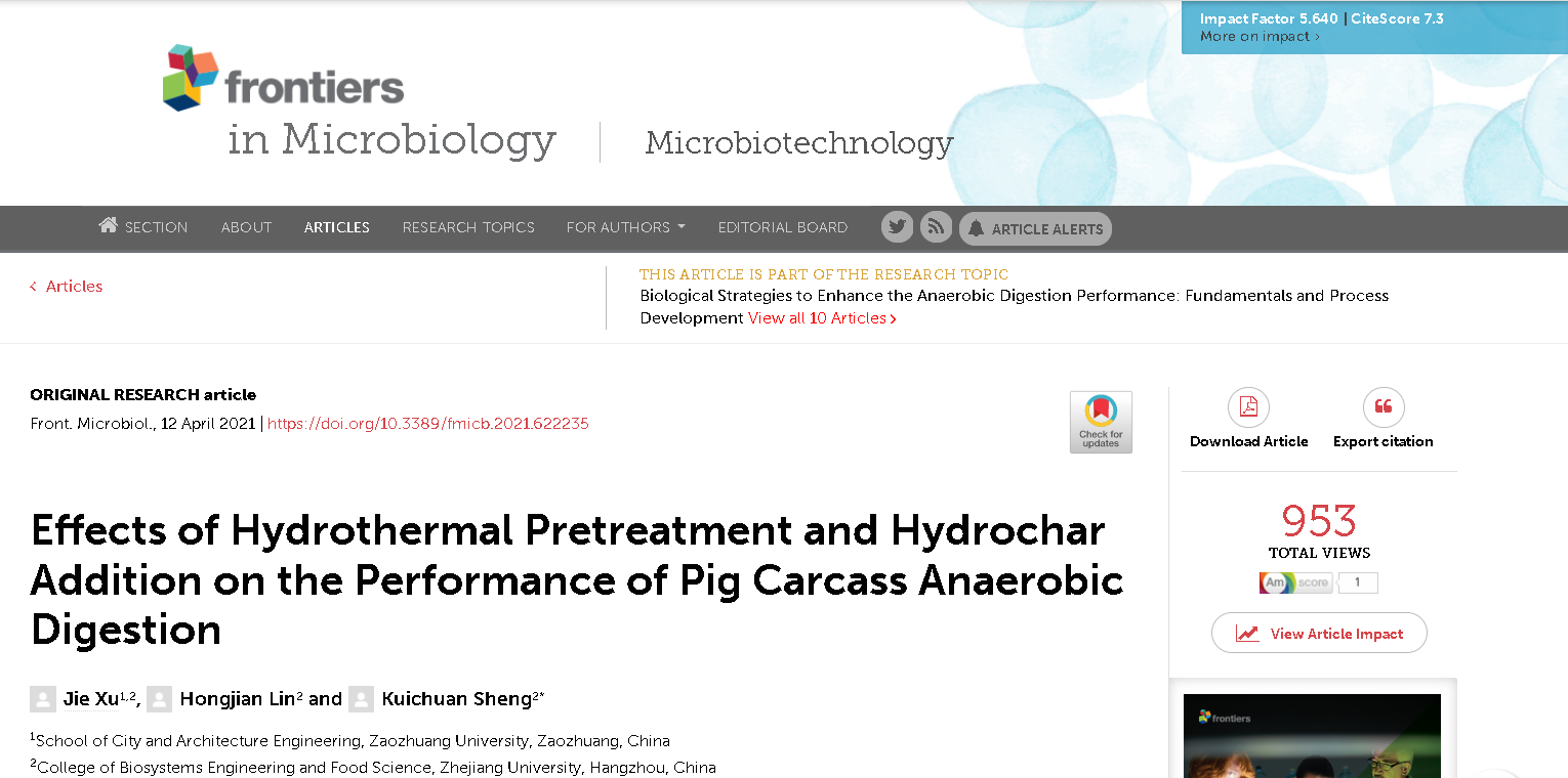近日,城市与建筑工程学院固废资源化综合利用科研小组在水热炭调控厌氧消化研究方面取得最新进展,相关工作发表在国际著名期刊《Frontiers in Microbiology》(中科院一区,TOP期刊,影响因子5.640)上,论文题目为《Effects of hydrothermal pretreatment and hydrochar addition on the performance of pig carcass anaerobic digestion》,易倍emc官网为第一单位,徐杰博士为论文第一作者。