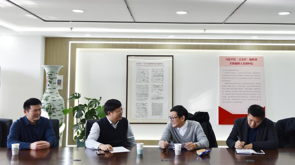 在山东大学《文史哲》编辑部,编辑部主任杜泽逊热情接待了李目海一行。李目海就墨子学刊创刊事宜及下一步工作与杜泽逊进行了充分交流讨论。
