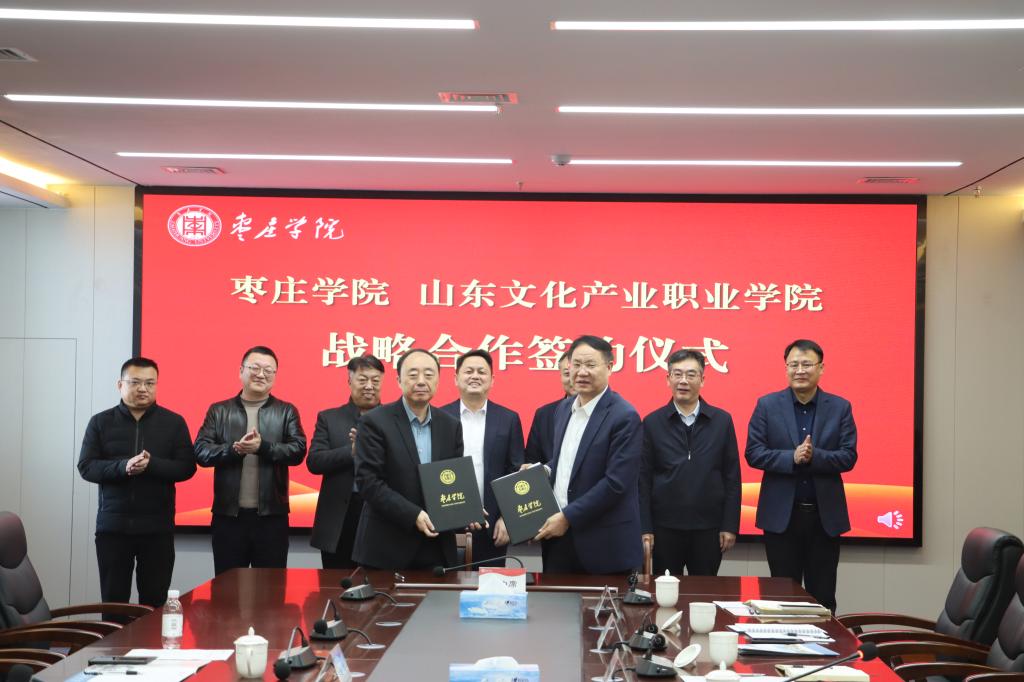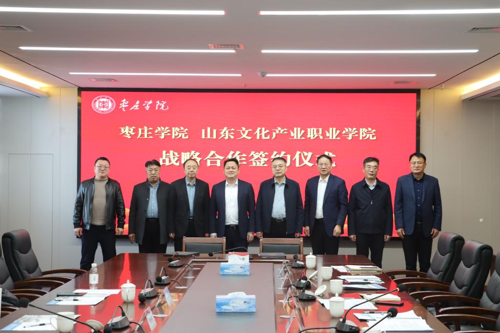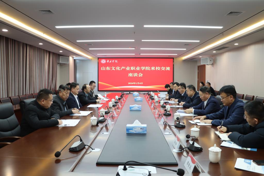 1月4日上午,山东文化产业职业学院董事长李京平,党委副书记、校长曹胜强一行5人来校考察交流。校党委书记高峰,党委副书记、校长李文喜,党委委员、副校长安涛,党委委员、统战部部长林勇热情接待。双方在薛城校区明理楼五楼会议室举行座谈,并签订战略合作协议。党委(校长)办公室、科技处、教务处、合作发展处、校园建设与管理处等部门负责人参加座谈交流。座谈会由安涛主持。
