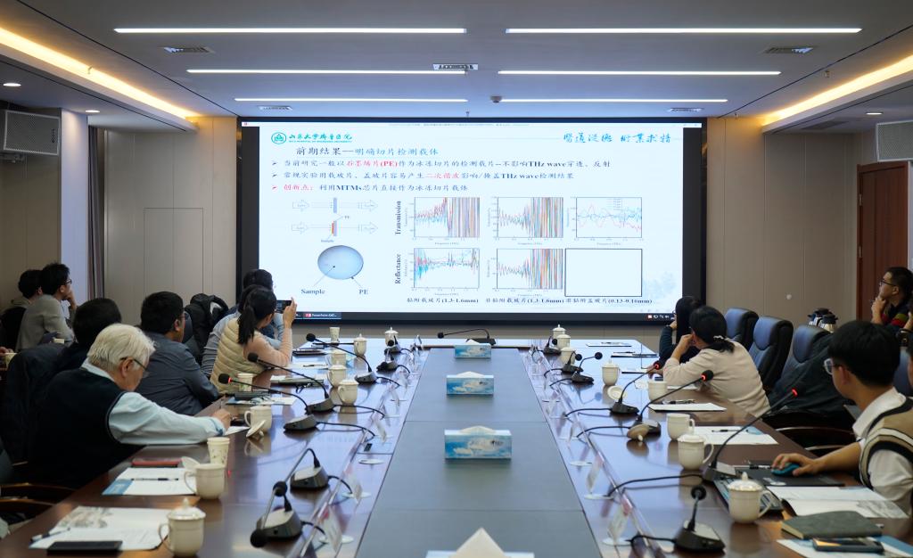 在学术交流环节,山东大学齐鲁医院神经外科博士王青桐首先作学术报告,系统地介绍了脑胶质瘤精准诊疗新技术,以及与课题组合作开展的基于THz-MTMs生物传感器技术实现颅脑术后感染快速检测的研究计划和当前进展。随后,课题组联培研究生田汇涵对目前最新的实验结果进行了展示汇报。