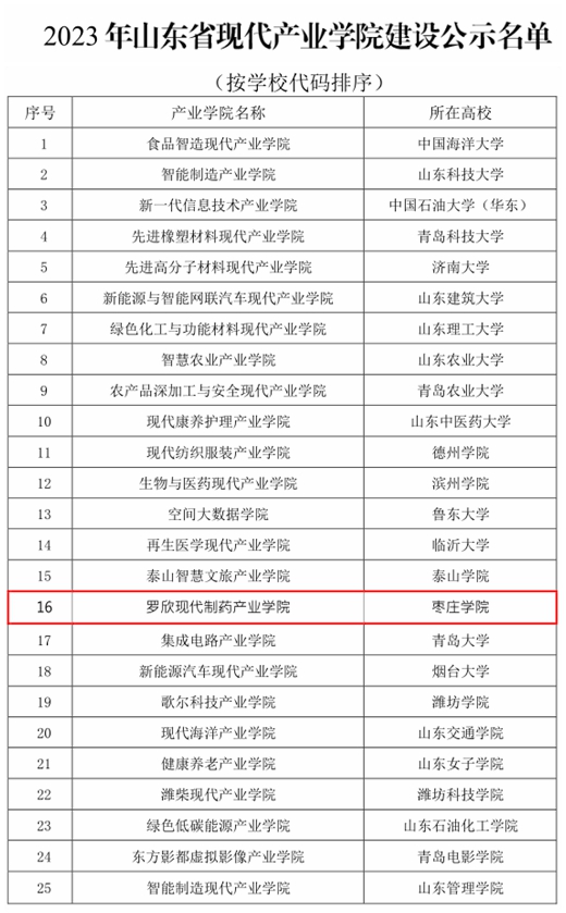 近日,山东省教育厅、山东省工业和信息化厅下发《关于公布2023年山东省现代产业学院建设名单的通知》(鲁教高函〔2023〕42号),确定25个产业学院为2023年支持建设的山东省现代产业学院,我校罗欣现代制药产业学院榜上有名,成为继锂电产业学院之后获批的第二个省级现代产业学院。