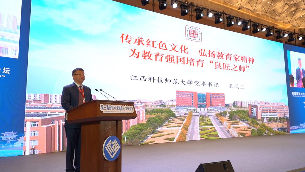 江西科技师范大学党委书记裴鸿卫首先作了题为“传承红色文化 弘扬教育家精神,为教育强国培育‘良匠之师’”的报告。他指出,习近平总书记在文化传承发展座谈会上的重要讲话,为我们以时代精神激活中华优秀传统文化的教育价值、坚定职教文化自信指明了前进方向。裴鸿卫表示,江西是中国红色文化的重要发祥地,江西红色文化是“两个结合”的具体体现,江西科技师范大学致力于打造“红色基因示范校”,以红色文化赋能创新型人才培养,在培养高素质职教师资队伍上有所作为,通过多渠道深入开展红色文化研究,推动红色文化进校园进课堂进教材,推动红色文化赋能实践育人。