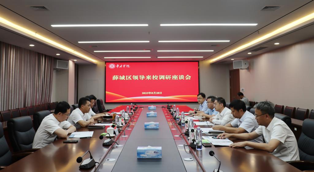 8月28日上午,薛城区委书记巴海峰、区委副书记李军一行4人来我校调研。校党委书记高峰热情接待了巴海峰一行,双方在薛城校区明理楼五楼会议室举行座谈。校党委委员、副校长李目海、丰雷,党委委员、统战部部长林勇,办公室负责人参加座谈会。