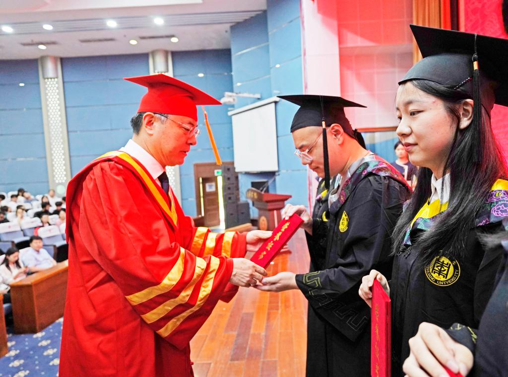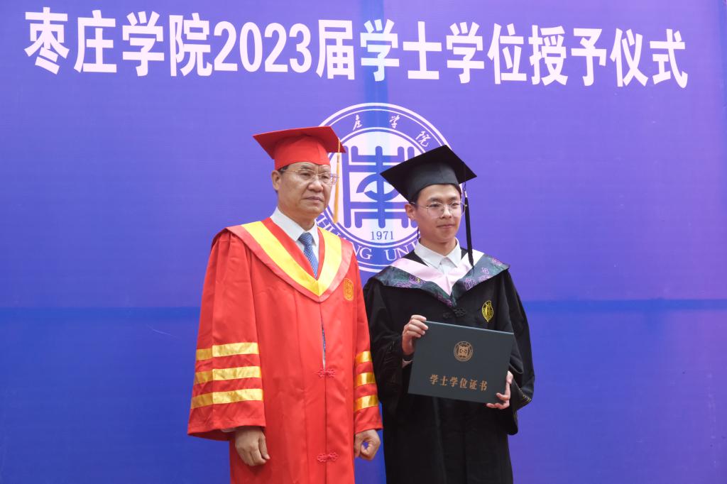 随后,61名毕业生代表满怀书山跋涉的喜悦,在欢快的音乐声中走上主席台,校学位评定委员会主席、校长李文喜依次为他们拨穗正冠、颁发学士学位证书并合影留念。