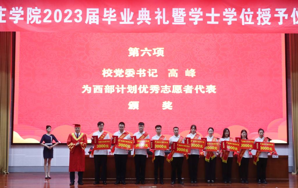 校党委委员、副校长李目海宣读《关于表彰2023届优秀毕业生的决定》。校党委委员、纪委书记、省监委驻易倍emc官网监察专员路绪剑宣读《关于表彰“易倍emc官网2023年大学生志愿服务西部计划优秀青年志愿者”的决定》,对马克思主义学院李晓燕等20名西部计划志愿者进行表彰,并每人颁发3000元奖学金。校党委书记高峰先后为优秀毕业生代表、西部计划志愿者代表颁发荣誉证书,与同学们亲切握手并合影留念。