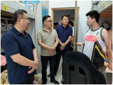 丰雷一行先后查看了学校大门、学生公寓、办公楼、警务室等场所。每到一处,认真了解相关情况,实地排查安全问题及隐患,对相关工作进行现场指导,要求有关部门对排查的风险隐患和安全问题及时整改,务必做到立行立改、即知即改。丰雷还深入学生宿舍,与毕业生进行交谈,鼓励毕业生走上工作岗位后继续积极进取、不懈奋斗,以积极主动的心态面对未来的挑战,用自己的智慧和勤劳的双手开创属于自己的事业,用优异的成绩回报母校和老师。