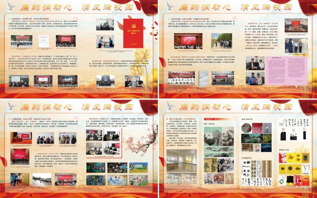 廉洁文化建设展是我校认真贯彻落实习近平总书记关于新时代廉洁文化建设的重要论述、深入贯彻落实党的二十大精神和党中央《关于加强新时代廉洁文化建设的意见》的具体举措,也是我校开展主题教育的重要内容。本次展览围绕“夯实思想根基、打造特色品牌、分类精准施策、倡廉成果荟萃”四个板块,图文并茂地展示了近年来我校廉洁文化建设情况和成果,生动展现出干部师生崇廉尚洁的精神风貌和境界追求。