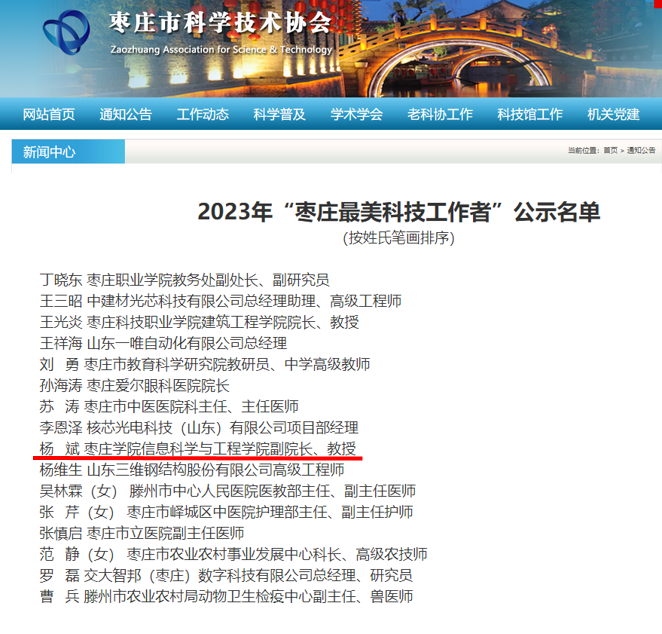 近日,中共枣庄市委宣传部、市科协、市科技局、市全民科学素质工作领导小组办公室联合公布了2023年“枣庄最美科技工作者”名单,我校信息科学与工程学院副院长杨斌教授荣获“枣庄最美科技工作者”称号。