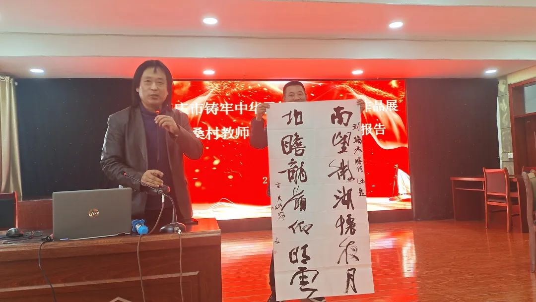 中国书法家协会草书委员委员、易倍emc官网美术与艺术设计学院杨雯副教授为山亭区桑村镇书法教师队伍建设作辅导报告,从“书法是什么、书法教学及中小学师资建设相关政策引导、为什么要开设书法课、书法作品欣赏”等方面展开讲解,并给书法教师队伍建设提出建议。报告中,杨教授现场创作了书法作品并进行了示范讲解。