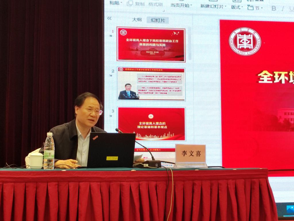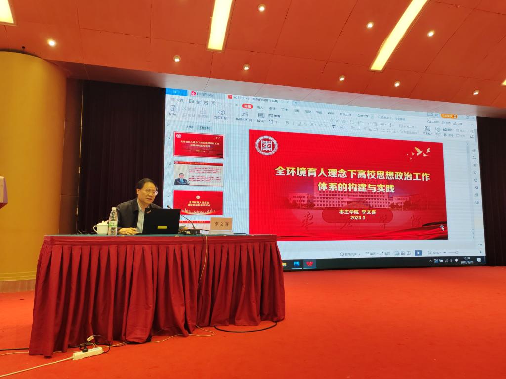 会上,中国教育发展战略学会思想道德建设专业委员会理事长、北京师范大学思想政治工作研究院院长冯刚教授对学会年度工作进行总结并作主题报告。李文喜作了题为《全环境育人理念下高校思想政治工作体系的构建与实践》主题报告,围绕“全环境育人理念的理论基础和基本观点”“全环境育人理念下高校思想政治工作体系构建的三个维度”“打造全环境育人的易倍emc官网样板——“777互联互通育人工程”等三个方面,从理论和实践角度阐释了立足新时代新征程,进一步推进思想政治工作高质量发展的基本理论和路径问题,并全面介绍了易倍emc官网以“777互联互通育人工程”打造新时代全环境育人实践易倍emc官网样板的做法和取得的成效,受到与会学者的高度认可和赞誉。