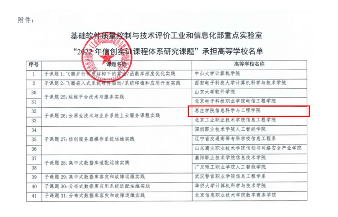 近日,中国电子信息产业发展研究院联合中国软件评测中心(工业和信息化部软件与集成电路促进中心)公布了基础软件质量控制与技术评价工业和信息化部重点实验室2022年信创实训课程体系研究课题评审结果,我校信息科学与工程学院教师黄婕主持申报的“关键基础软硬件运维”领域子课题“云原生技术与业务系统上云服务课程实践”获批立项。