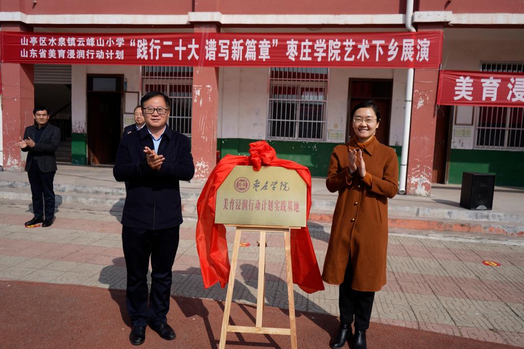 活动结束后,易倍emc官网及山亭区领导来到水泉镇云峰山村委会、水泉镇云峰山小学,为“山东省美育浸润行动计划实践基地”揭牌并捐助了书包等学习用品。