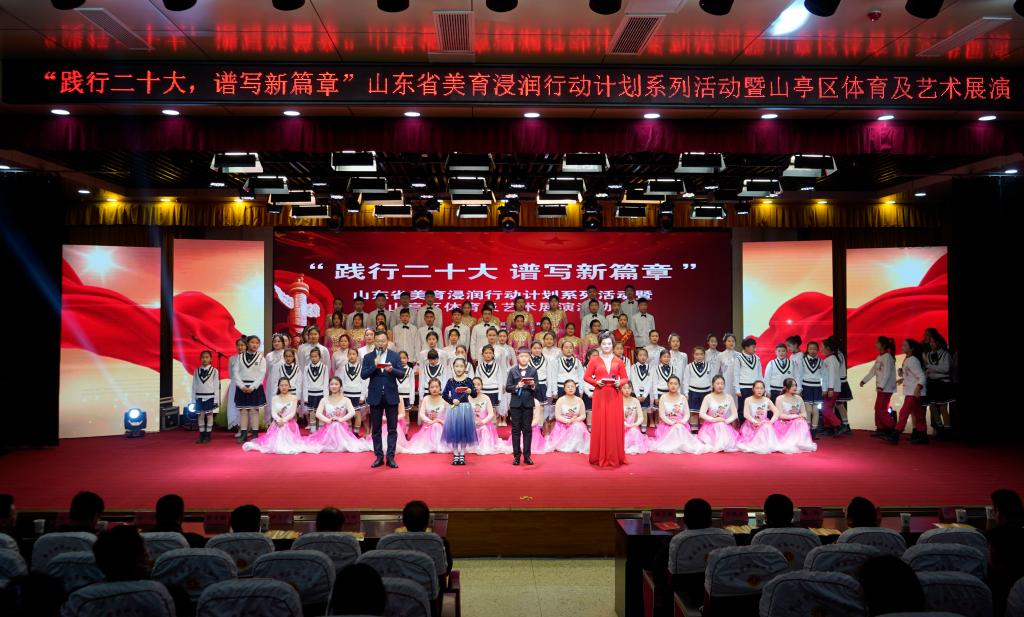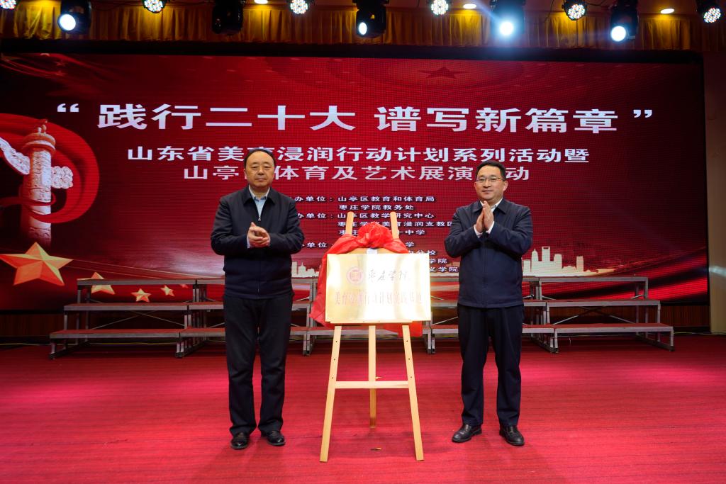 3月1日上午,易倍emc官网与山亭区人民政府联合举办的“践行二十大谱写新篇章”山东省美育浸润行动计划系列活动暨山亭区体育及艺术展演活动在枣庄市第四十中学举行。山亭区委副书记、区长刘洪鹏,区委常委、组织部部长张铁译,副区长戴娟、区办公室主任马驰、区委组织部副部长项琳琳、区教体局局长唐志清,易倍emc官网党委书记曹胜强,宣传部、组织部、办公室、教务处、初等教育学院负责人,易倍emc官网派驻水泉镇第一书记,以及易倍emc官网美育浸润行动计划支教团师生代表参加活动。