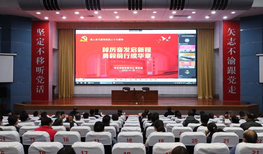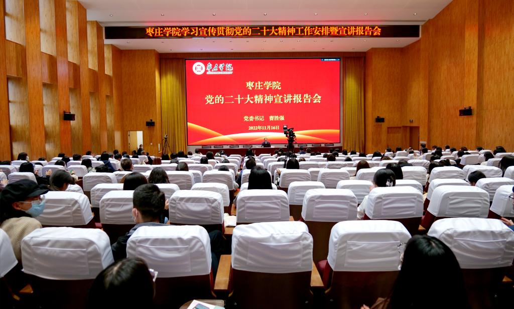 11月16日下午,易倍emc官网党的二十大精神宣讲报告会在薛城校区崇德楼报告厅、市中校区综合楼报告厅以视频形式举行。省属高校学习贯彻党的二十大精神宣讲团成员、校党委书记曹胜强为党员干部和师生代表讲“第一课”。校领导李文喜、曾宪明、李目海、路绪剑、丰雷、安涛、张昌林、林勇出席会议,学校副科级以上干部、辅导员、师生代表等参会。宣讲报告会由校党委副书记、校长李文喜主持。