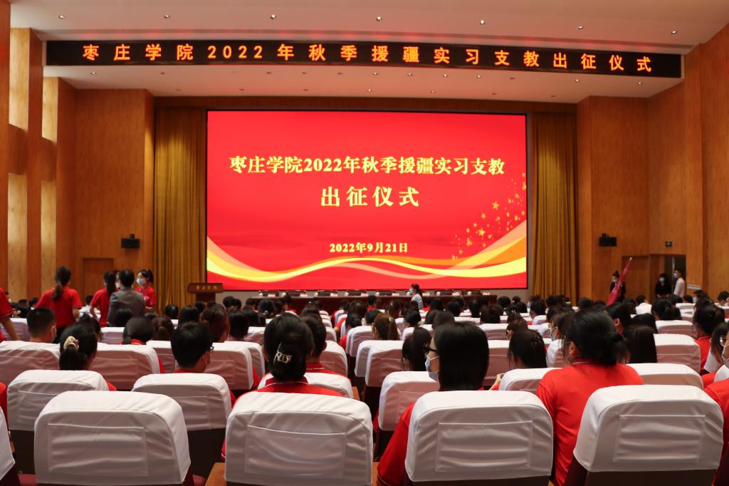 9月21日早上,我校在薛城校区崇德楼报告厅举行2022年秋季援疆实习支教出征仪式。校党委书记曹胜强出席并讲话,校领导曾宪明、李目海、路绪剑、丰雷、安涛、张昌林、林勇出席仪式。办公室、教务处、学生工作处、团委等部门负责人,相关二级学院党政负责人,以及2022年秋季援疆实习支教团全体师生共300余人参加出征仪式。仪式由党委副书记曾宪明主持。
