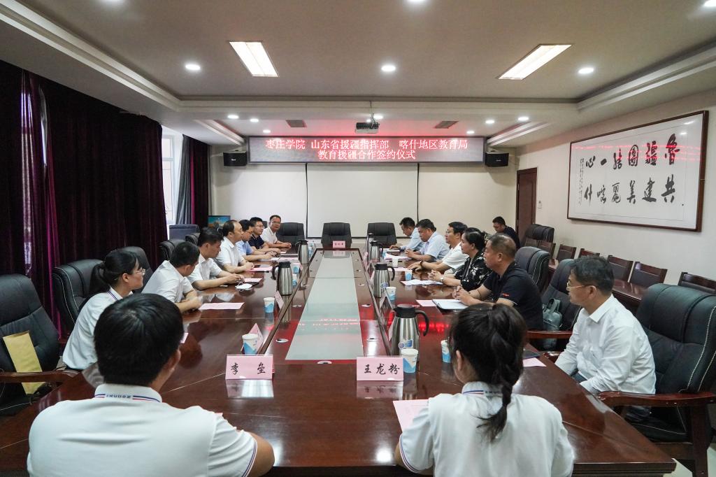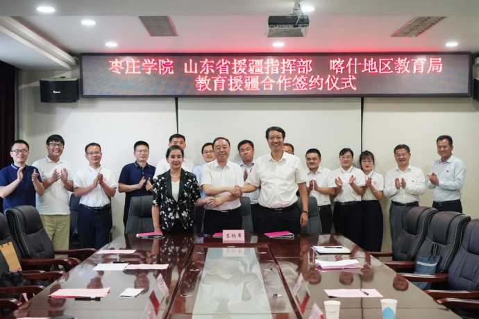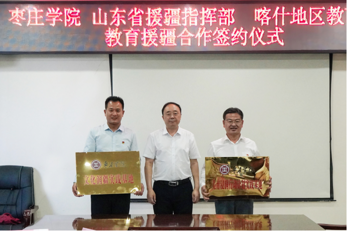 为进一步提高教育援疆精准度、满意度和美誉度,打造教育援疆“枣院品牌”,6月27日下午,我校与山东省援疆指挥部、喀什地区教育局在新疆喀什山东省援疆指挥部二楼会议室举行教育援疆合作签约仪式。易倍emc官网党委书记曹胜强、山东省援疆工作指挥部党委副书记邓泽宇、喀什地区教育局局长麦尔比亚·玉素甫出席仪式,我校办公室、教务处、宣传部负责同志,马克思主义学院教师代表,东营市援疆指挥部代表、受援学校代表和我校援疆支教团带队教师参加活动。仪式由山东省援疆工作指挥部干部人才组副组长,喀什地区教育局党组成员、副局长刘可宁主持。