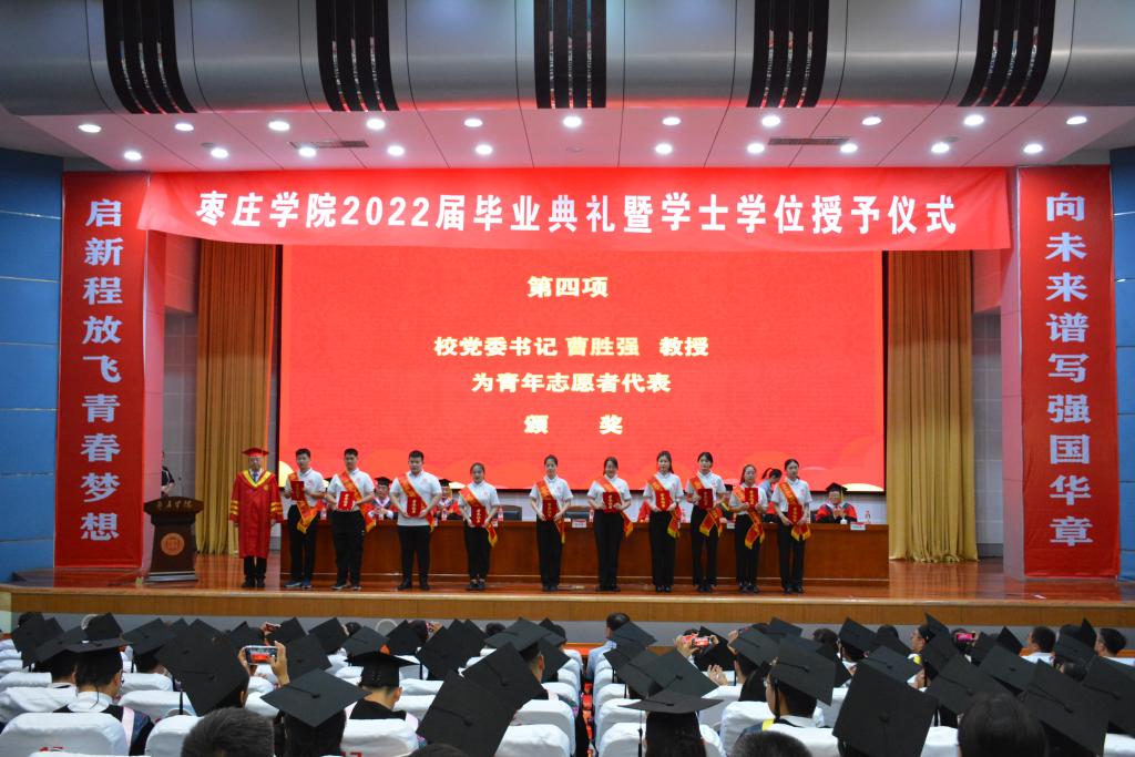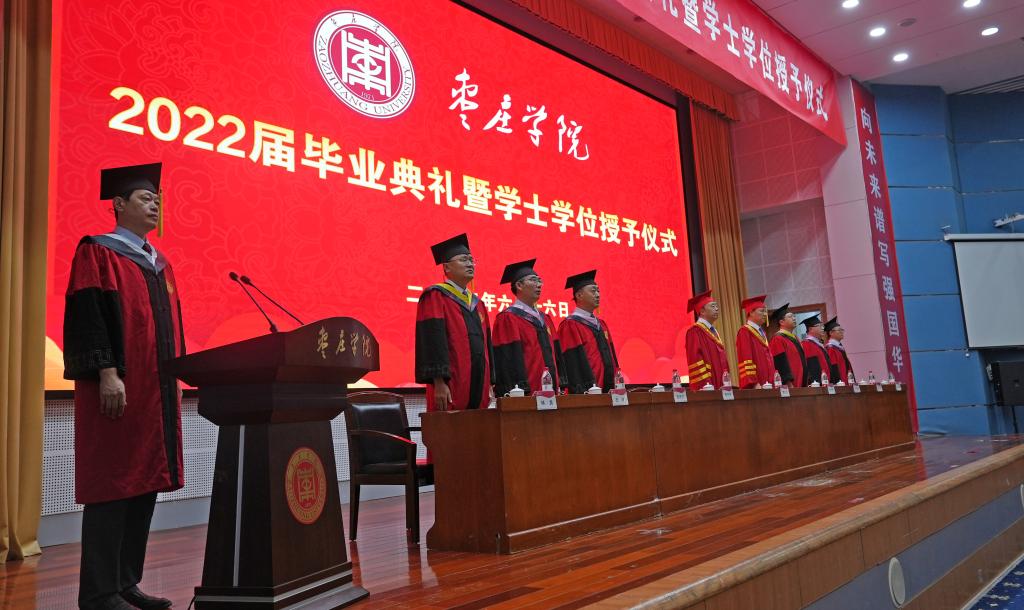 毕业典礼坚持以文化人、文化育人。印有“启新程放飞青春梦想”“向未来谱写强国华章”字样的对联写真分列在会场两侧,鲜红的写真激励着毕业生们承时代使命、展奋斗风采,也祝福着毕业生们毕业快乐、鹏程万里。典礼前,播放了学校为2022届毕业生精心制作的毕业生MV《不说再见•枣院版》,记录了同学们在枣院的美好回忆。毕业生们手持学校精心制作的手牌,一起合唱MV主题曲《不说再见》,歌声弥漫,以证此谊;情意深厚,望君珍重。