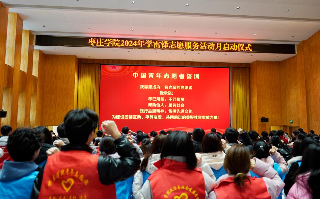 在全国第61个“学雷锋纪念日”来临之际,为认真贯彻落实习近平总书记关于开展学雷锋活动的重要指示,深刻把握雷锋精神的时代内涵,引领广大青年在志愿服务实践中大力弘扬“奉献、友爱、互助、进步”的志愿精神。3月5日上午,我校在薛城校区崇德楼报告厅、市中校区文科楼报告厅举行“学习雷锋精神 争做追‘锋’青年”学雷锋志愿服务活动月启动仪式。校党委委员、副校长丰雷出席仪式,离退休工作处、学生工作处、校团委负责同志,各二级学院团总支书记、青年志愿者学生代表共300余人参加活动。仪式由校团委书记袁心主持。
