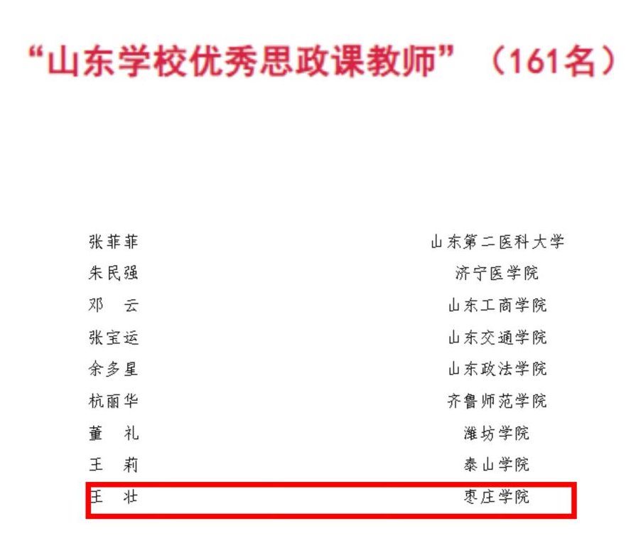 近日,山东省教育厅(省委教育工委)公布了2023年度 “山东学校思政课教师年度人物”评选结果。经过地市(高校)推荐、材料审核、专家评审、现场答辩等环节,全省共评选出“山东学校思政课教师年度人物”11名、“山东学校优秀思政课教师”161名。其中,我校马克思主义学院王壮老师以高超的教学本领、先进的教学理念以及优秀的教学成果获评“山东学校优秀思政课教师”,充分展示了我校思政课教师的良好风采。