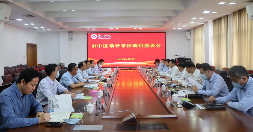 4月26日下午,市中区委书记宋磊,区委副书记、区长韩耀辉等一行9人莅临市中校区调研。校党委书记曹胜强、校长李文喜、副校长丰雷热情接待了宋磊一行。区人大常委会主任、党组书记侯宗伟,区委常委、办公室主任靳勇,区委办分管日常工作的副主任、区档案局局长于殿亮,区政府办公室主任徐敏,区教育和体育局局长宋钢,区卫生健康局局长焦艳红,齐村镇党委书记刘立人,我校办公室、学生工作处、教务处、后勤服务处、保卫处等部门负责人陪同调研。