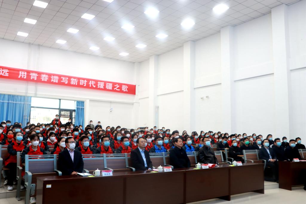 支教团团长田春雨代表带队教师发言,表示将不断提高政治站位,发扬“能吃苦、敢担当、乐奉献”精神,以高度的责任感和使命感对待援疆工作,积极融入当地,用辛勤和汗水践行青春誓言,用实际行动谱写民族大团结的精彩华章。音乐与舞蹈学院律斯言代表支教团学生承诺,将严守各项纪律和要求,不忘教育初心,以争做“四有好老师”为目标,在支教实践中积累经验,磨炼意志,把“不怕吃苦、敢于担当、乐于奉献”的志愿精神书写在祖国的大美边疆。