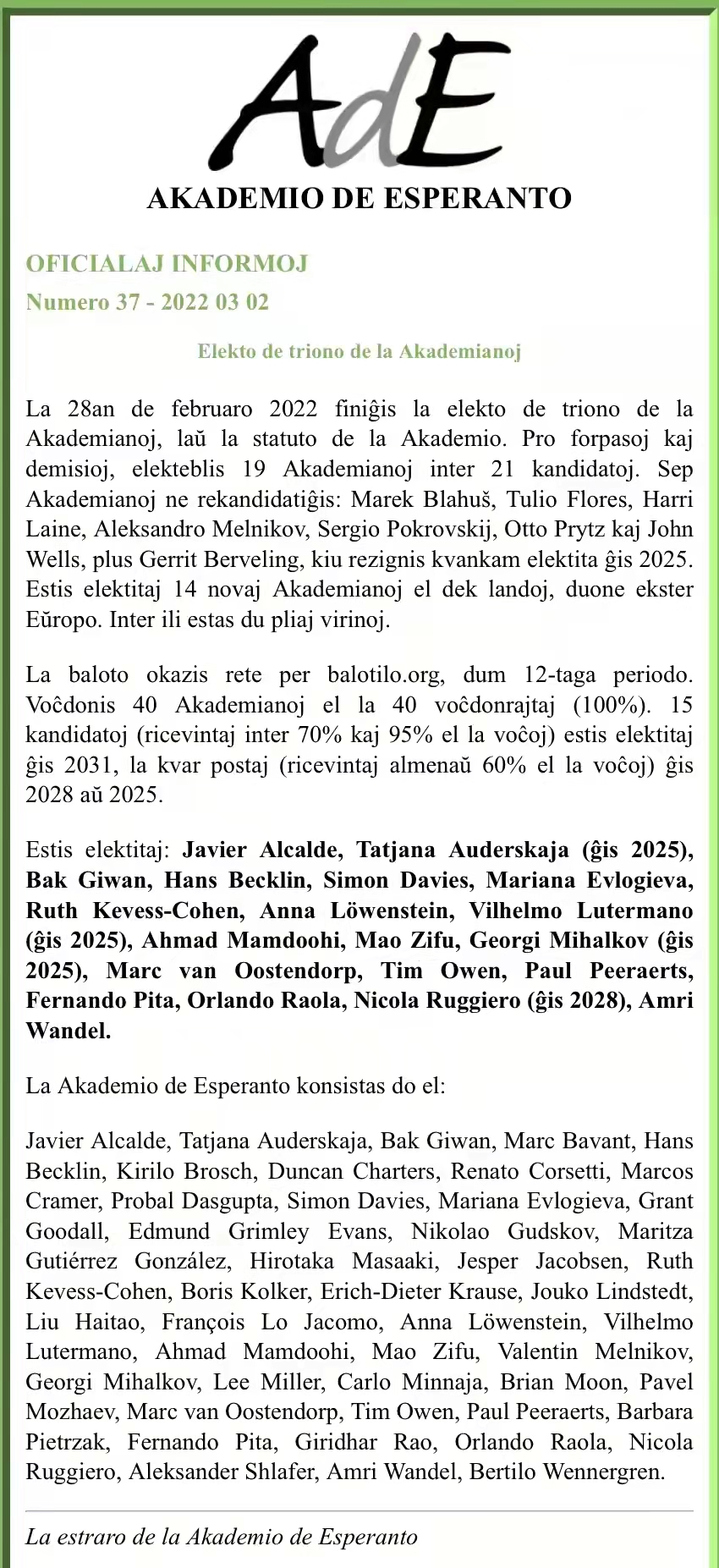 3月2日,国际世界语学院更新了成员名单,我校韩国教师朴基完博士和我国湖南诗人毛自富当选为新一届院士,任期至2031年。