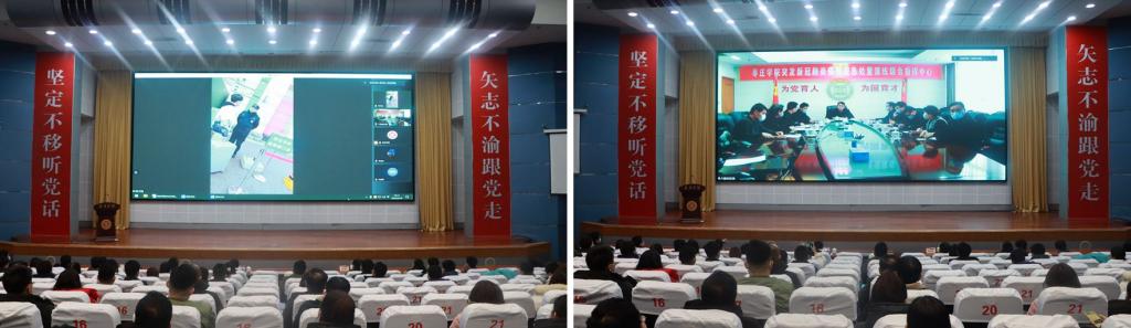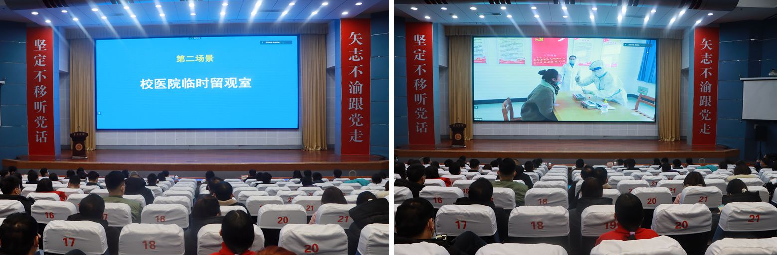 学校疫情防控工作领导小组办公室全体成员,相关部门负责人,各学院党总支副书记,全体辅导员在市中校区报告厅通过视频观摩了整场演练。