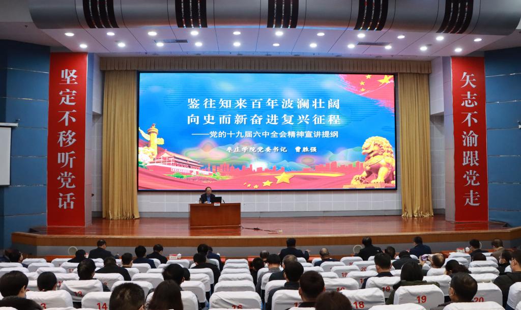 12月9日下午,我校十九届六中全会精神专题学习班开班,校党委书记曹胜强以《鉴往知来百年波澜壮阔 向史而新奋进复兴征程》为题,在综合楼学术报告厅作党的十九届六中全会精神宣讲报告。校领导李文喜、曾宪明、李目海、丰雷、张昌林、林勇出席,省委党史学习教育第四巡回指导组成员苗素军到场巡听,学校副科级以上干部共200余人到场聆听报告。新城校区在明理楼201会议室设分会场同步直播。