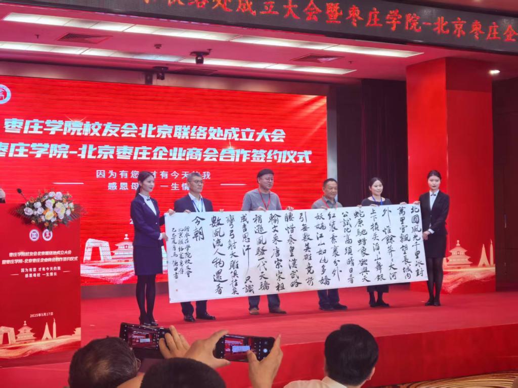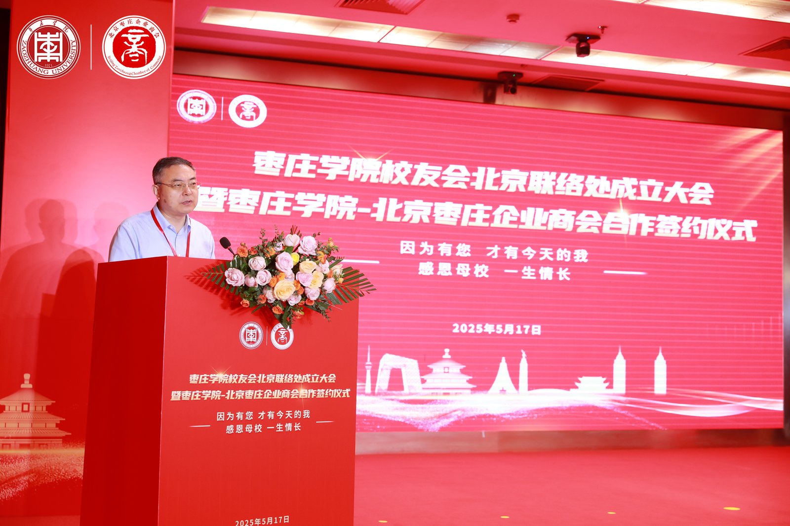 高峰代表学校向大会成功举办和合作协议签署表示祝贺,向支持和帮助学校发展的各界人士表示感谢,并简要介绍了学校在人才培养、科学研究、社会服务和国际交流等方面取得的成绩。他指出,学校抢抓转型发展机遇,办学规模和实力持续增强;深化内涵发展,平台载体和人才队伍建设成效突出;大学文化与地方文化对接,形成了独具特色的文化品牌;持续深化校地融合,有组织服务精准有力;不断扩大对外交流合作,国际化之路拓宽提速。高峰对北京联络处提出三点希望:一是强化纽带作用,当好“联络员”,以乡情、学缘为纽带,主动搭建校友与母校、校友与社会之间的沟通平台,定期组织活动,促进信息共享、资源互通,让每一位在京校友都能感受到“家”的温暖与力量。二是聚焦发展需求,当好“服务员”,立足校友实际需求,创新服务形式,发挥好北京枣庄企业商会作用,在职业发展、创新创业、生活互助等方面提供务实支持,尤其要关注、帮助年轻校友在首都扎根立业。三是发挥平台优势,当好“宣传员”,依托北京地缘优势,积极宣传母校发展成就,扩大易倍emc官网的社会影响力;同时汇聚校友智慧,为母校学科建设、人才培养、产学研合作建言献策,共同助力母校高质量发展。